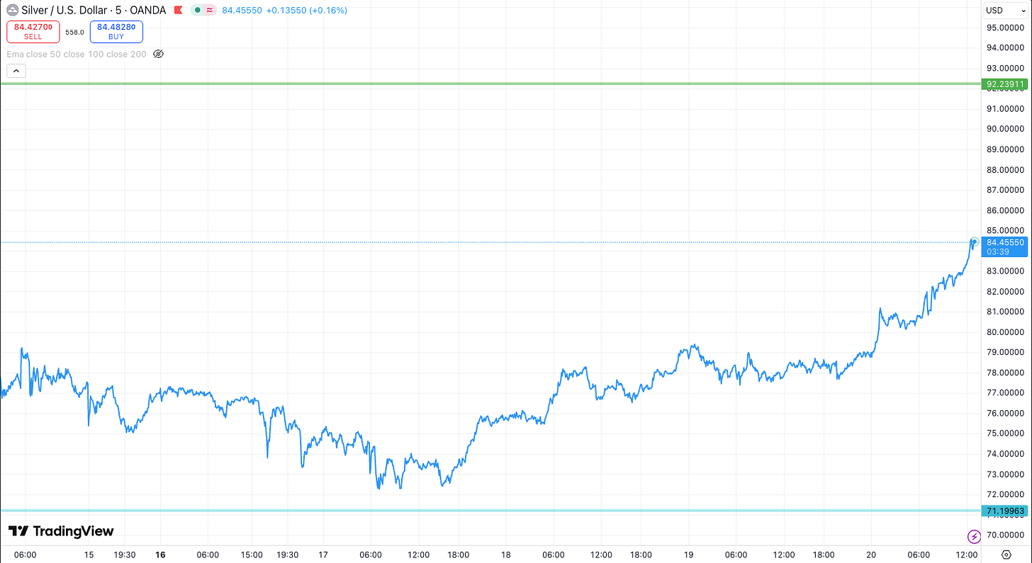 Silver had a volatile but ultimately bullish week, climbing from roughly $72 at the start of the week to closing north of $84 per ounce, a gain of roughly 18% on the week from Tuesday’s lows.